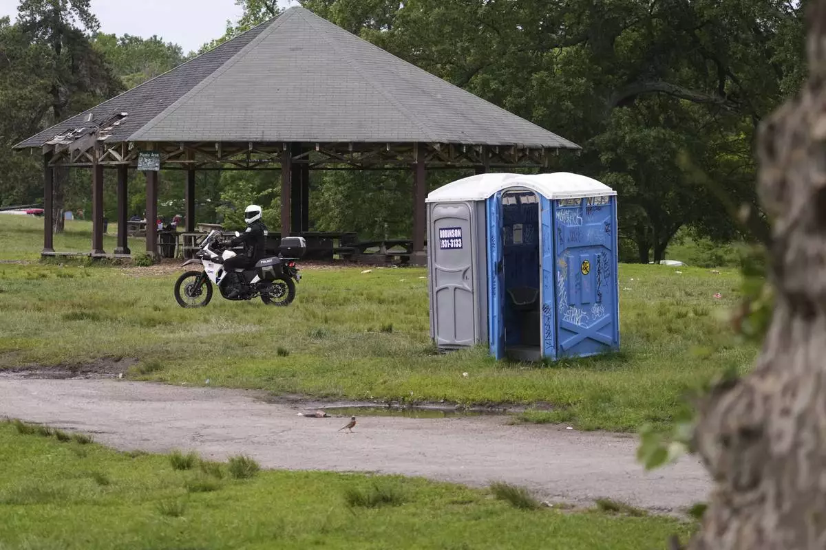 A Philadelphia Police officer rides through the Lemon Hill area of Fairmont Park the day after a shooting, Tuesday, May 27, 2025, in Philadelphia. (AP Photo/Matt Slocum)