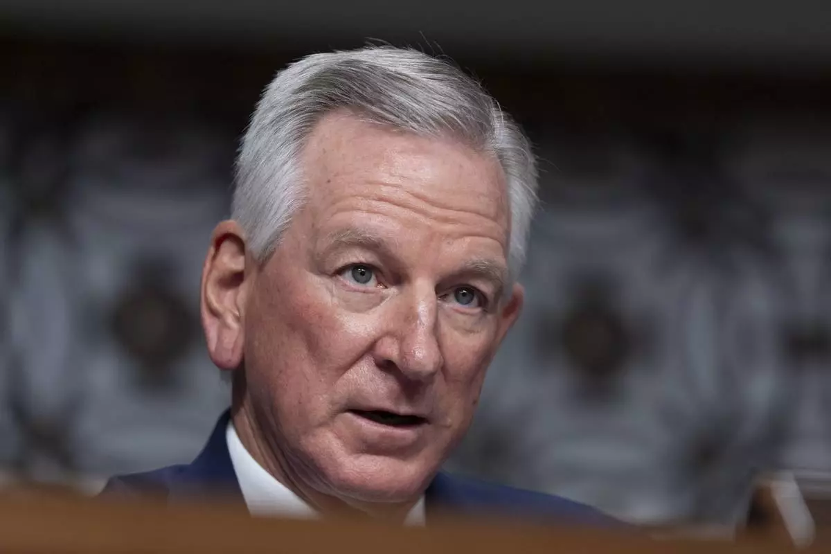 FILE - Senate Armed Services Committee member Sen. Tommy Tuberville, R-Ala., questions retired Air Force Lt. Gen. Dan "Razin" Caine during his confirmation hearing on his nomination to be promoted to general and chairman of the Joint Chiefs of Staff, April 1, 2025, in Washington. (AP Photo/Manuel Balce Ceneta, File)