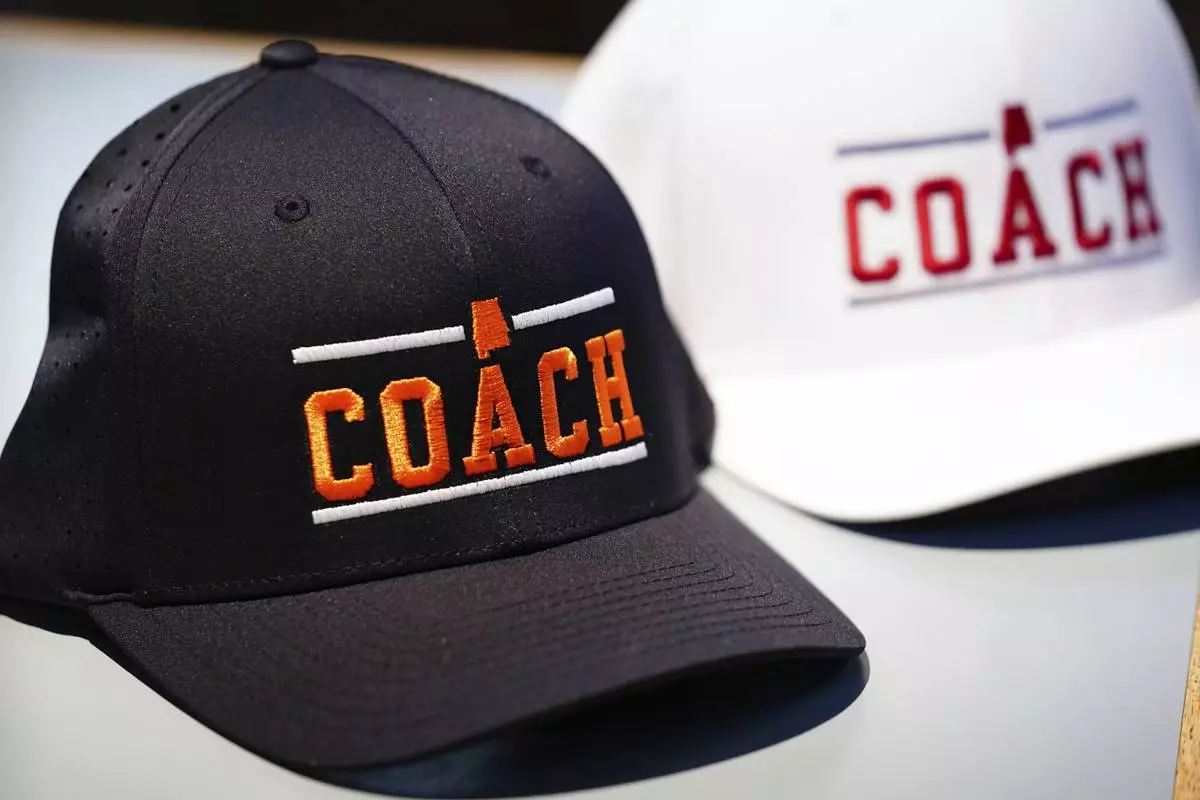 Ball caps for U.S. Sen. Tommy Tuberville, R-Ala., seen on a table as he speaks about plans to run for the governor of Alabama in 2026, Tuesday May 27, 2025 at Byron's Smokehouse in Auburn, Ala. (AP Photo/ John David Mercer)