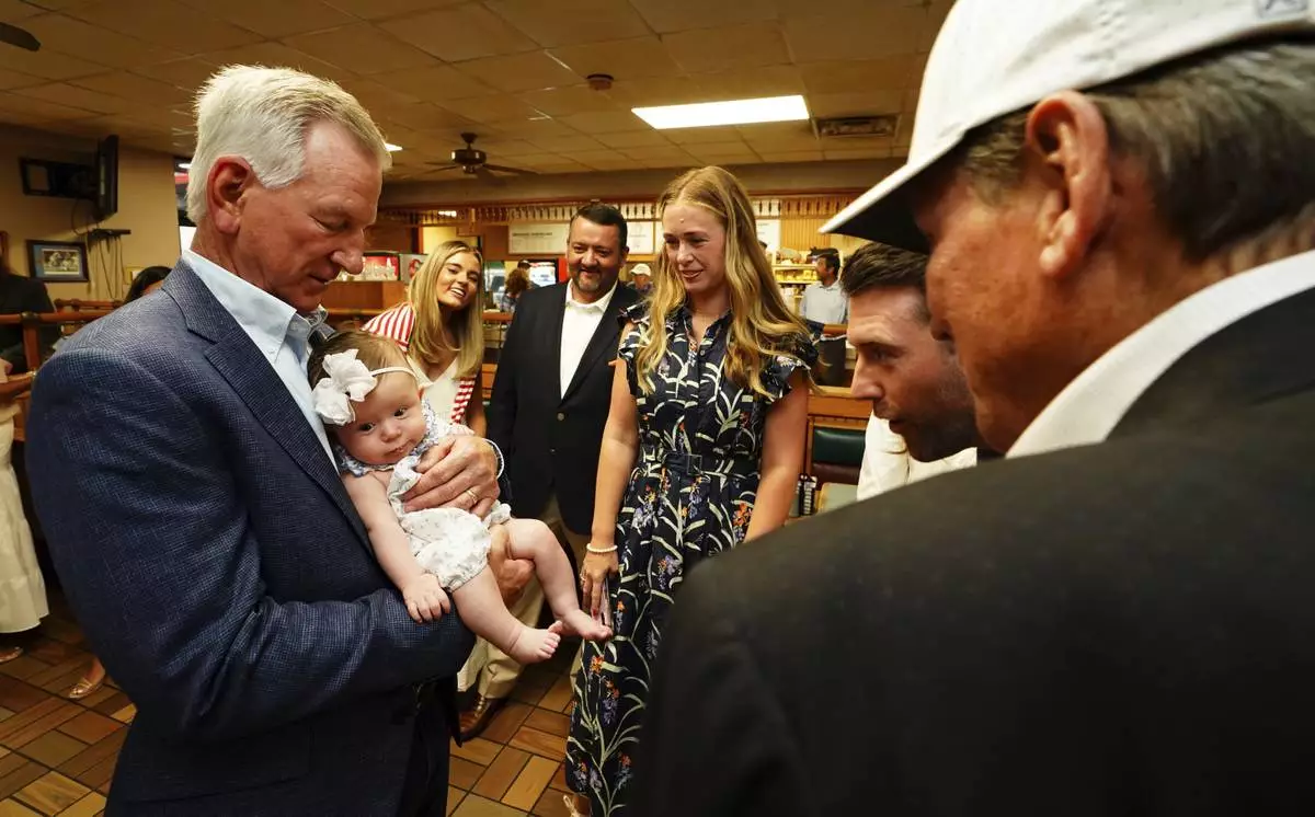 U.S. Sen. Tommy Tuberville, R-Ala., holds his granddaughter Rosie Grace Tuberville after he announced his plans to run for the governor of Alabama in 2026, Tuesday May 27, 2025 at Byron's Smokehouse in Auburn, Ala. (AP Photo/ John David Mercer)