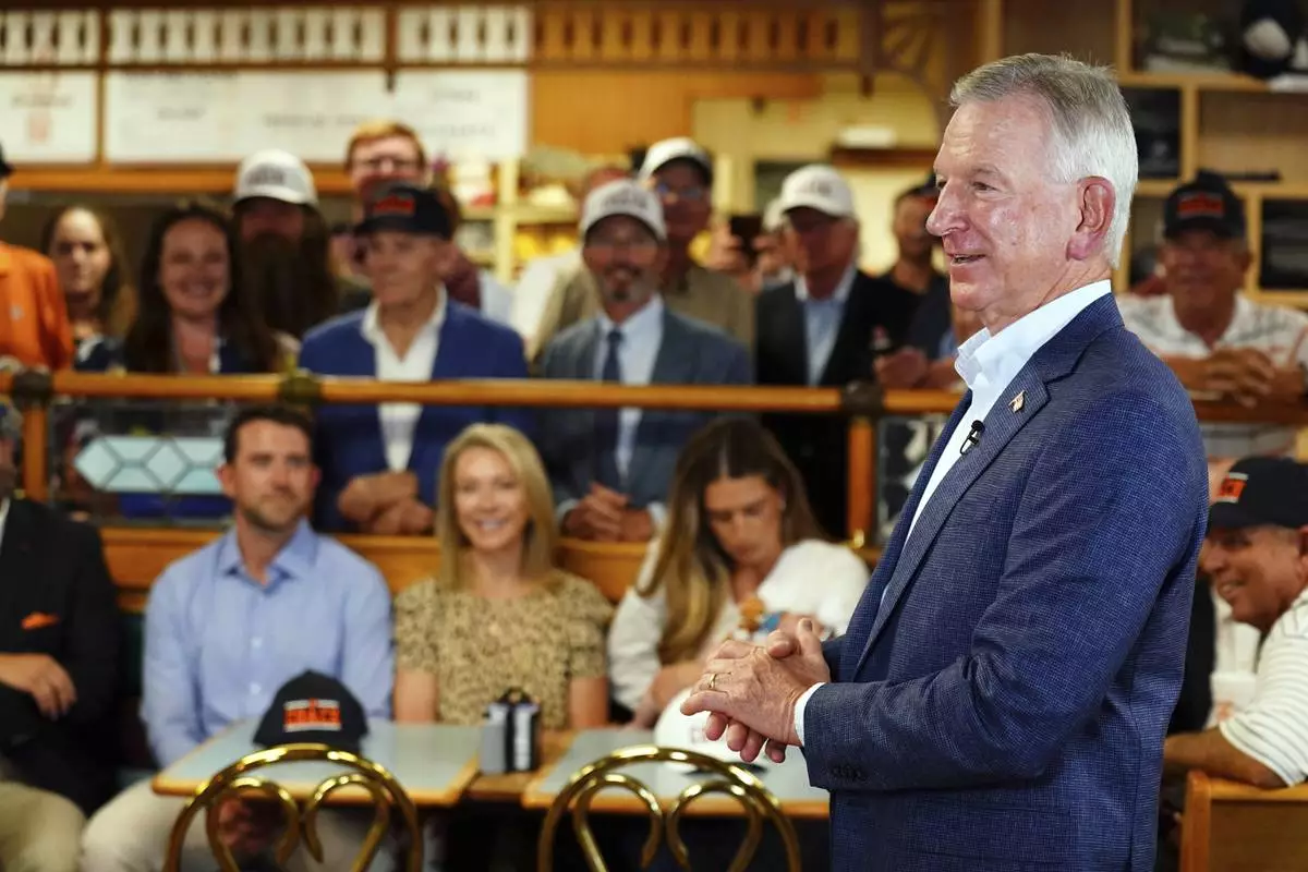 U.S. Sen. Tommy Tuberville, R-Ala., speaks about plans to run for the governor of Alabama in 2026, Tuesday May 27, 2025 at Byron's Smokehouse in Auburn, Ala. (AP Photo/ John David Mercer)