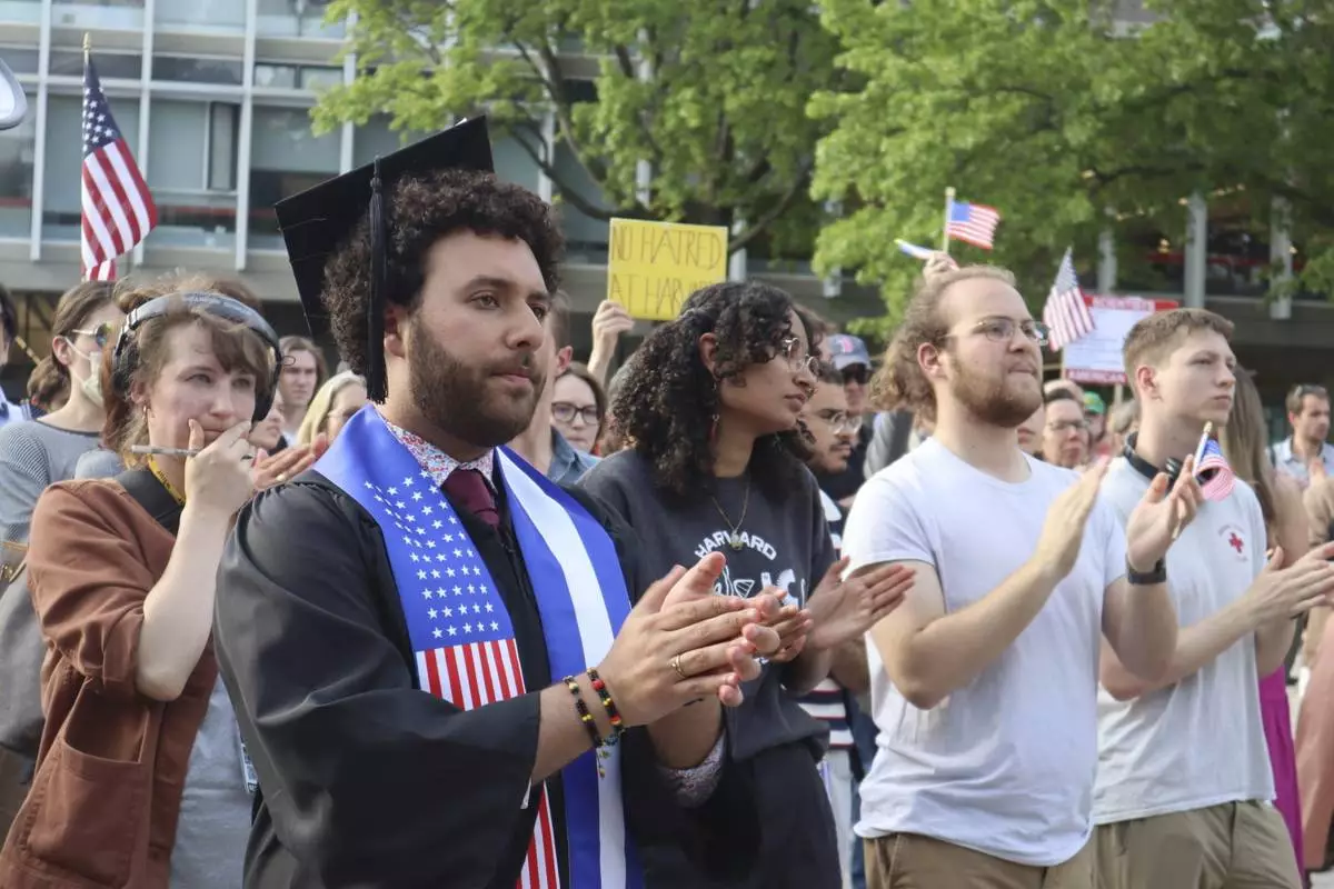 Harvard University graduating senior Victor Flores claps while listening to a fellow student speak at a protest against President Donald Trump's recent sanctions against Harvard in front of Science Center Plaza on Tuesday, May 27, 2025, in Cambridge, Mass. (AP Photo/Leah Willingham)