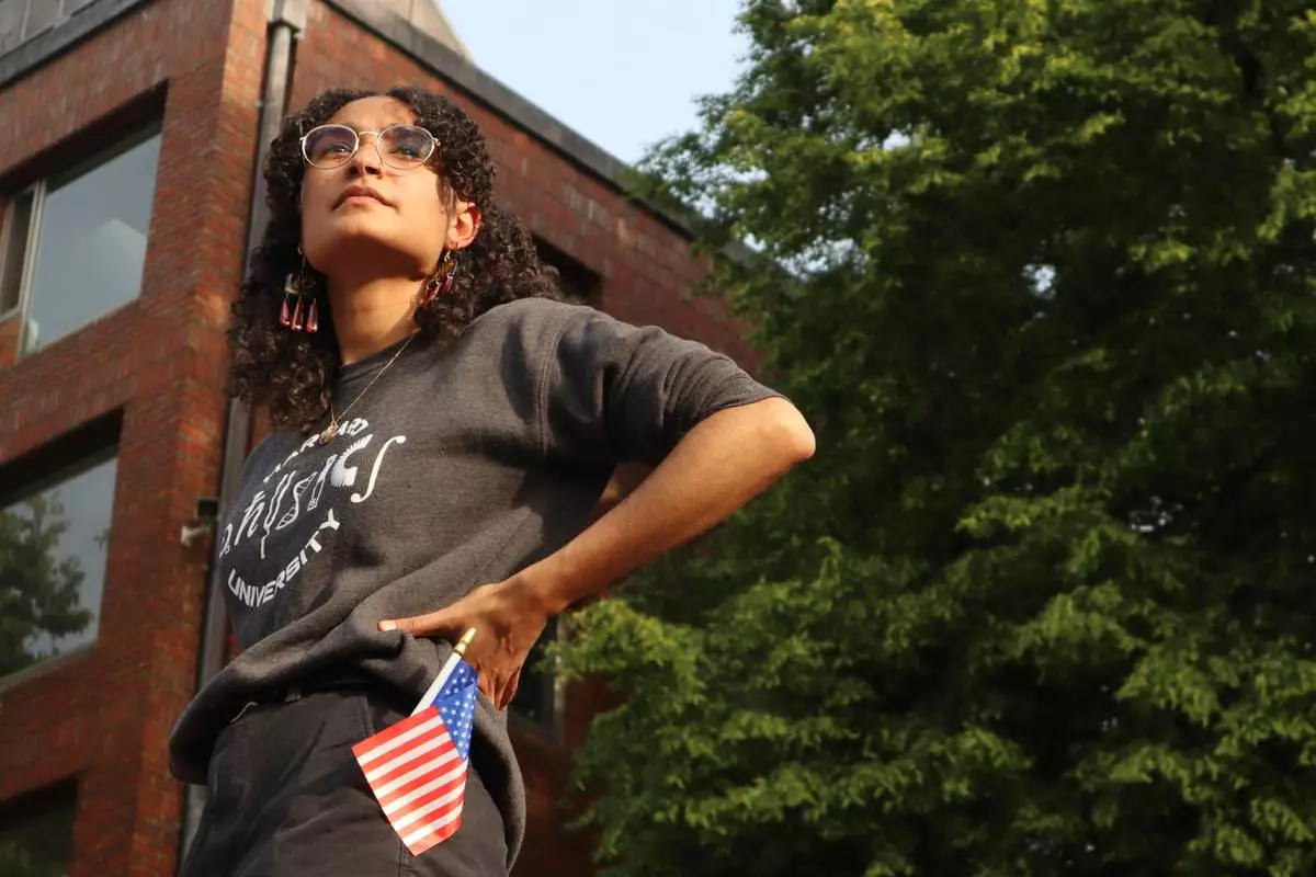Harvard University junior Avinashi Bhandari stands on the podium before speaking at a protest against President Donald Trump's recent sanctions against Harvard in front of Science Center Plaza on Tuesday, May 27, 2025, in Cambridge, Mass. (AP Photo/Leah Willingham)