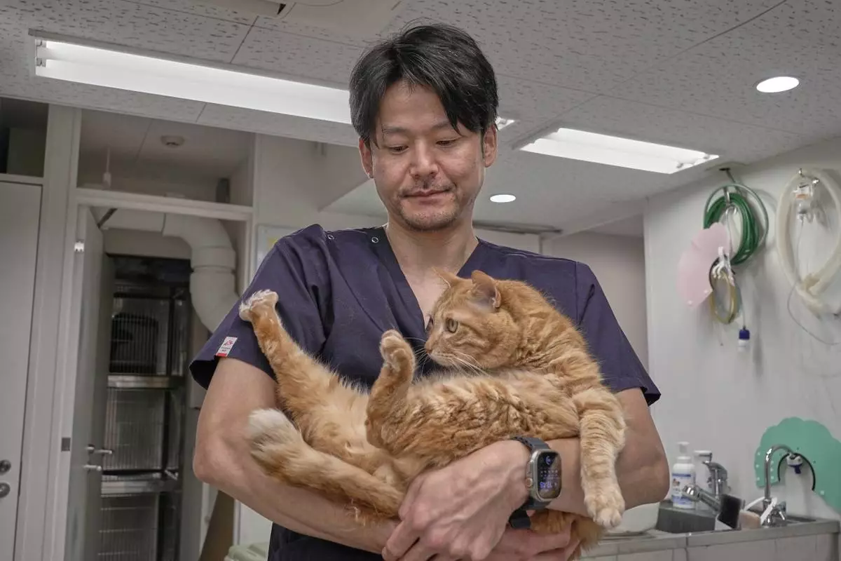 Veterinary surgeon Soshin Yamamoto holds his bobtail cat, Katsuo, at his practice in Tokyo on May 22, 2025. (AP Photo/Mayuko Ono)