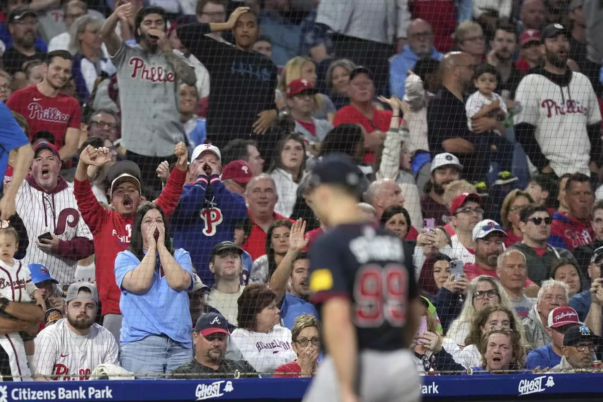 Fans react as Atlanta Braves pitcher Spencer Strider is pulled during the fifth inning of a baseball game against the Philadelphia Phillies Tuesday, May 27, 2025, in Philadelphia. (AP Photo/Matt Slocum)