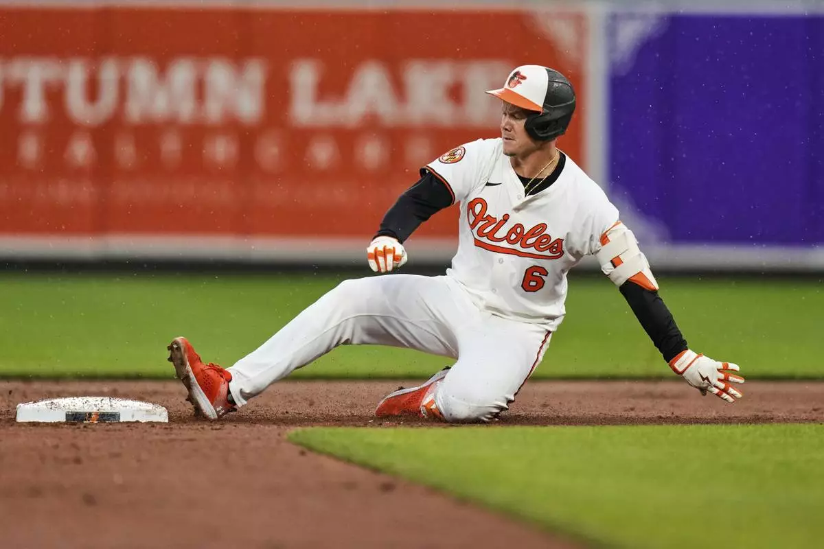 Baltimore Orioles' Ryan Mountcastle (6) slides into second base after hitting a double during the second inning of a baseball game against the St. Louis Cardinals, Tuesday, May 27, 2025, in Baltimore. (AP Photo/Stephanie Scarbrough)