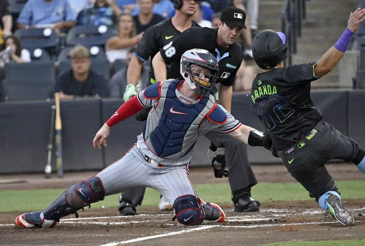 Minnesota Twins catcher Ryan Jeffers tags out Tampa Bay Rays' Jonathan Aranda (62) as Aranda trys to steal home during the second inning of a baseball game Tuesday, May 27, 2025, in Tampa, Fla. (AP Photo/Jason Behnken)