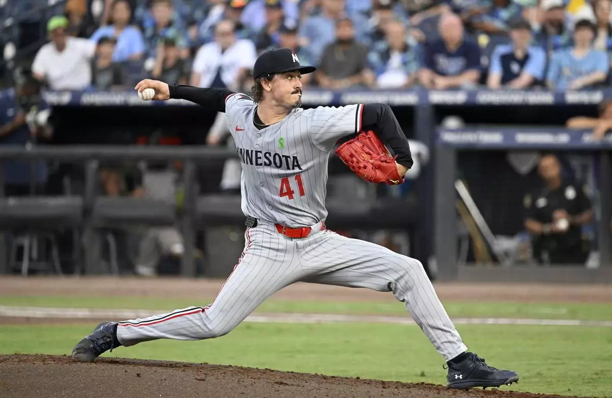Minnesota Twins pitcher Joe Ryan throws during the third inning of a baseball game against the Tampa Bay Rays Tuesday, May 27, 2025, in Tampa, Fla. (AP Photo/Jason Behnken)
