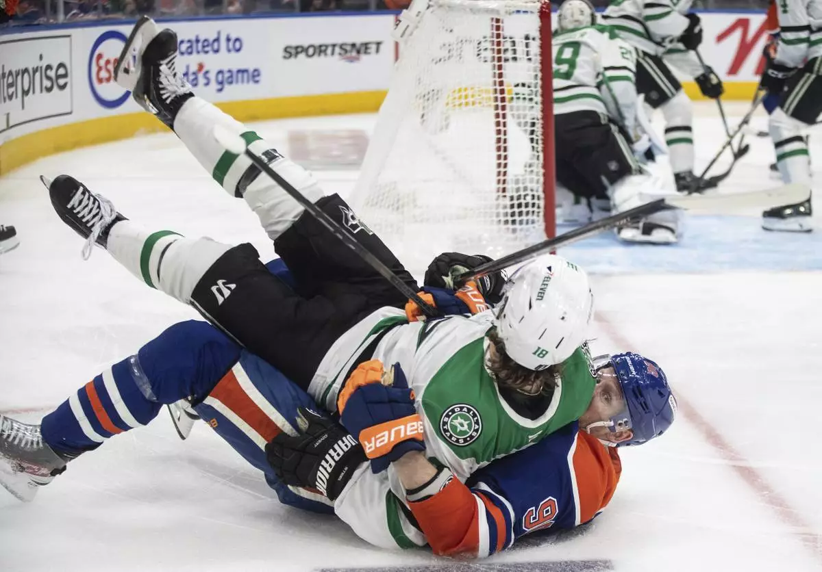 Dallas Stars' Sam Steel (18) and Edmonton Oilers' Corey Perry (90) get tangled up during second period NHL Western Conference final playoff action, in Edmonton on Tuesday, May 27, 2025. (Jason Franson/The Canadian Press via AP)