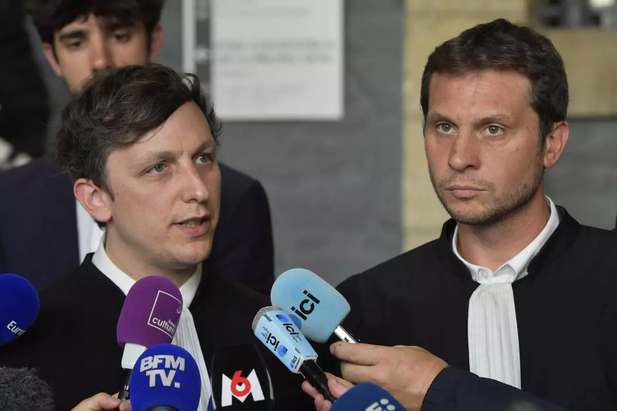 Maxime Tessier, left, and Thibaut Kurzawa, Joel Le Scouarnec's lawyers, answer reporters after the 74-year-old pedophile and former surgeon who raped hundreds of victims over a period spanning more than two decades was given a maximum 20-year prison sentence Wednesday, May 28, 2025 in Vannes, Brittany, western France. (AP Photo/Mathieu Pattier)