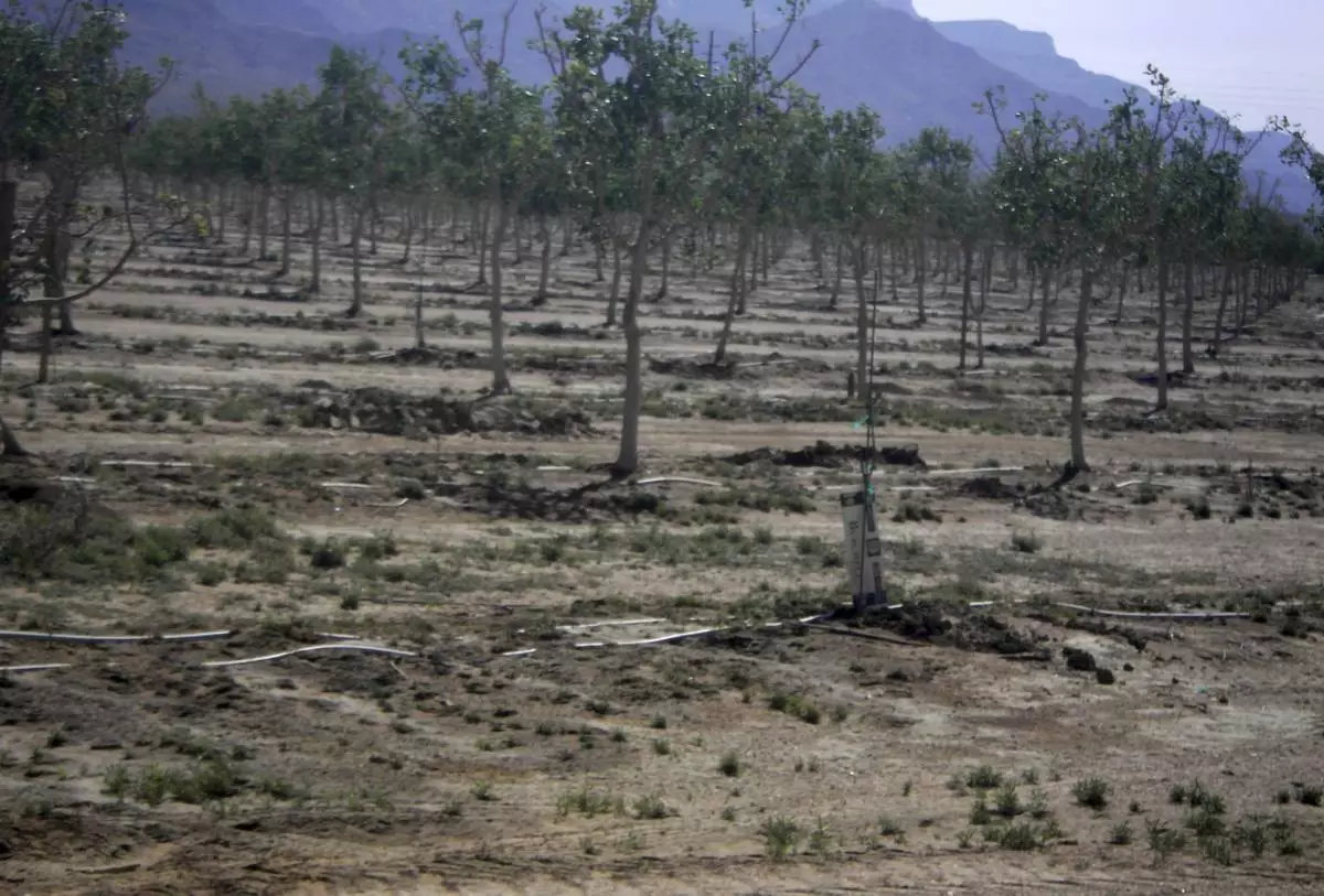 FILE - This April 18, 2022 photo provided by Mohave County shows orchards near Kingman, Ariz. where irrigation now has been limited. (Mohave County via AP, File)