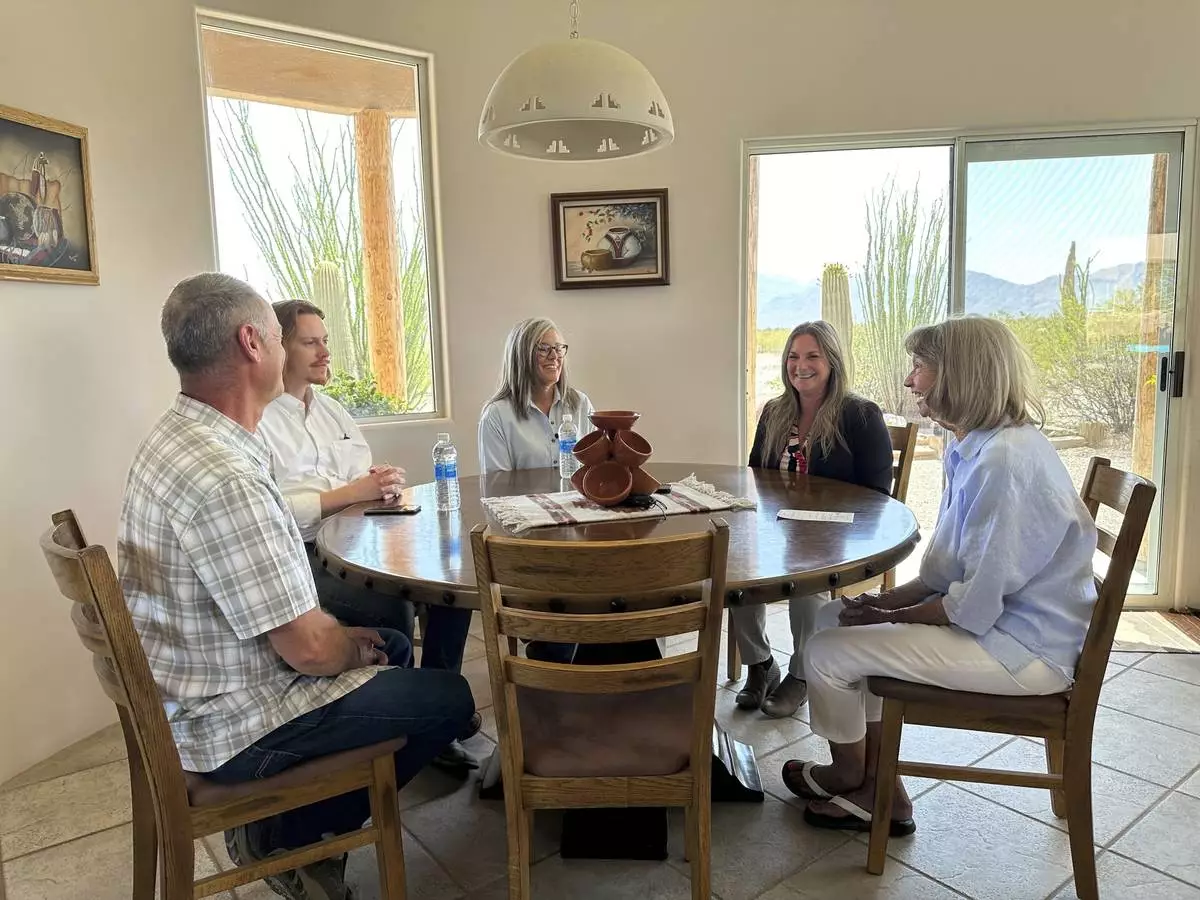 Arizona Gov. Katie Hobbs, center, meets with residents of western Arizona to talk about groundwater during a tour of La Paz County, Ariz., Wednesday, May 28, 2025. (AP Photo/Sejal Govindarao)
