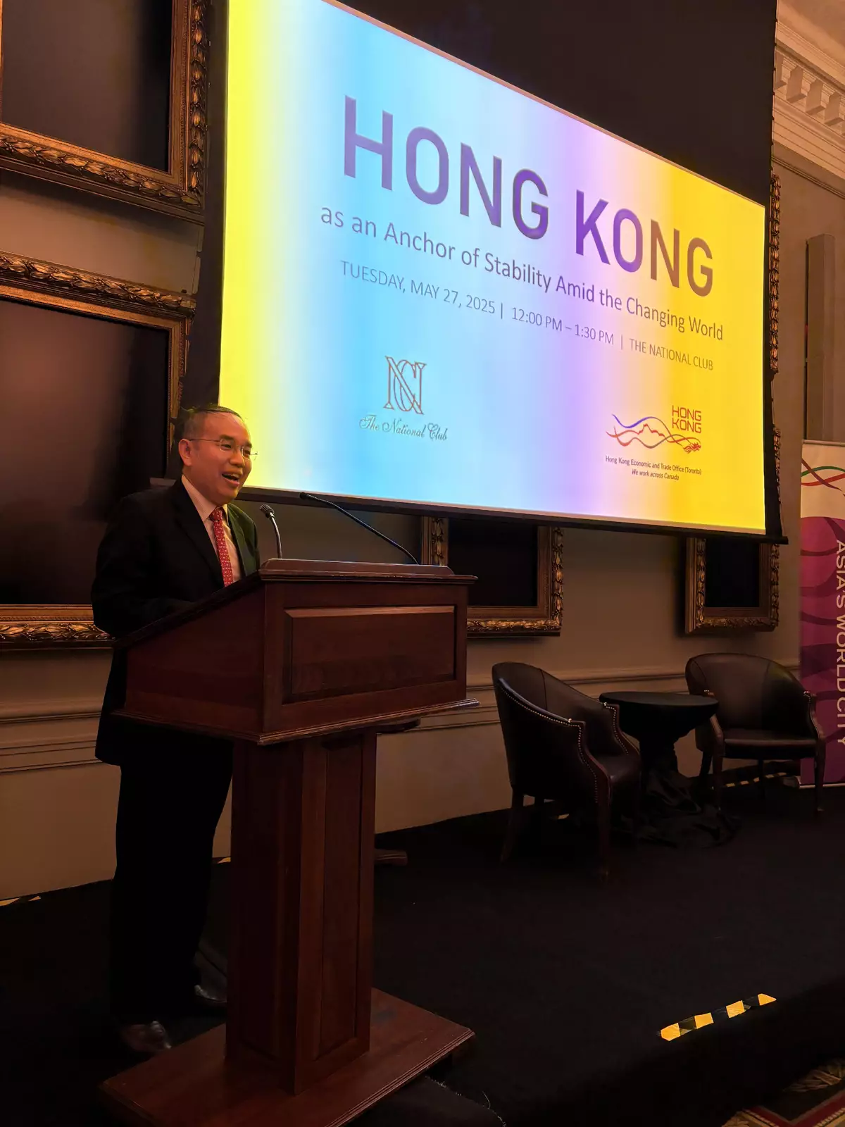 At noon, Mr Hui attended a business luncheon organised by the Hong Kong Economic and Trade Office (Toronto), Invest Hong Kong (Canada) and the National Club. He gave a presentation themed "Hong Kong as an anchor of stability amid the changing world" to showcase to the attending financial leaders the stellar figures recorded in the financial market, and banking and monetary markets. He also talked about the Government's efforts in aligning with international standards and boosting the development of green and sustainable finance and the virtual asset market. He said that, with its competitive advantages and proactive measures, as well as the stability and predictability of its financial market, Hong Kong has been earning the confidence of global investors. Mr Hui also had a fireside chat with the President of the National Club, Mr Arnie Guha, and answered questions from the floor. The luncheon was well received. Participants were attracted by the various new developments in Hong Kong's financial markets introduced by Mr Hui.