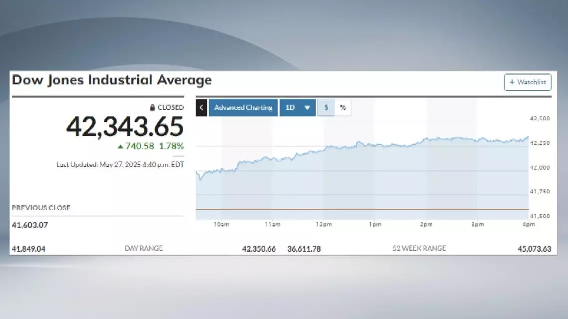 The Dow Jones Industrial Average rose 740.58 points, or 1.78 percent, to 42,343.65.