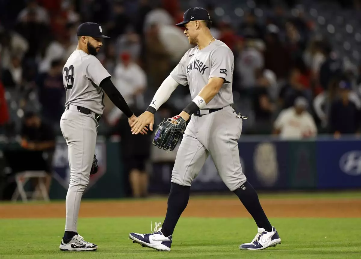 New York Yankees' Aaron Judge, right, congratulates relief pitcher Devin Williams after the last out against the Los Angeles Angels, Tuesday, May 27, 2025, in Anaheim, Calif. (AP Photo/Kevork Djansezian)