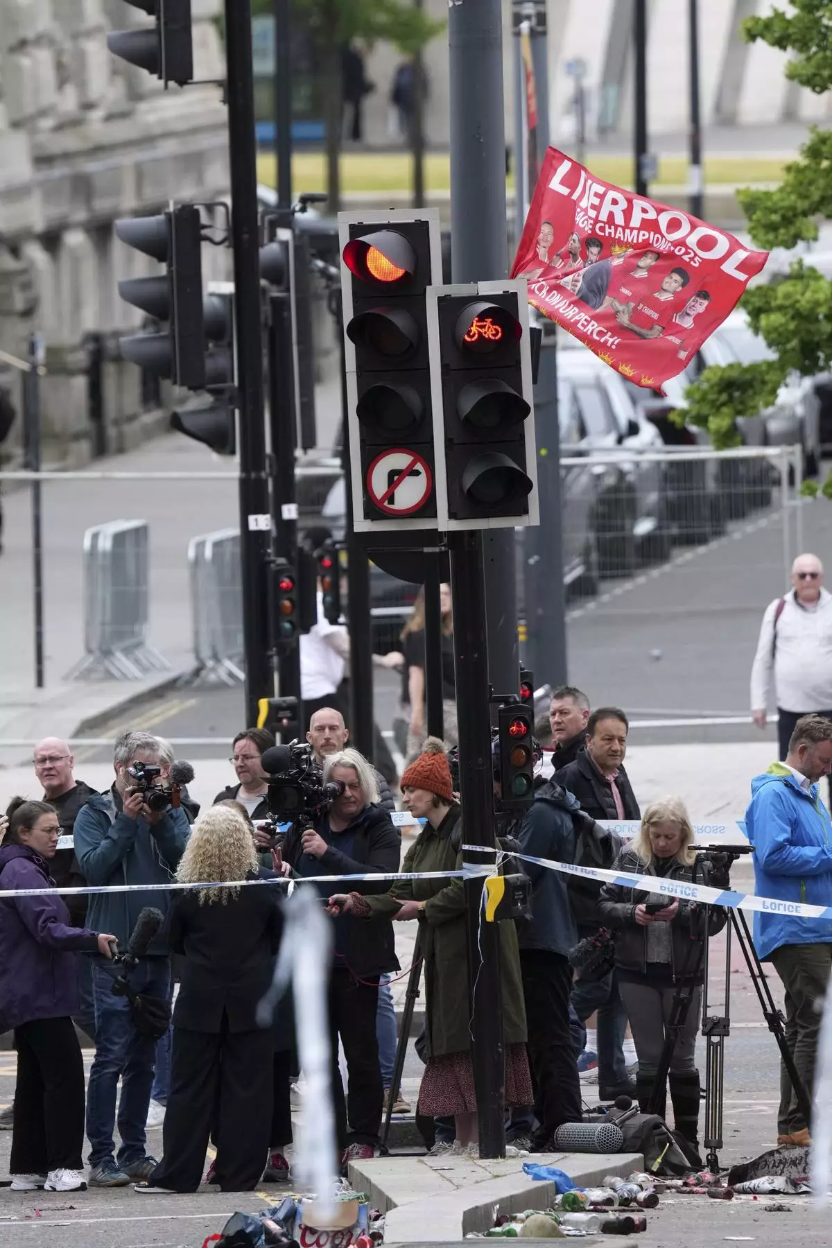 Media reports near the street where a 53-year-old British man plowed a minivan into a crowd of Liverpool soccer fans who were celebrating the city's Premier League championship Monday, injuring more than 45 people in Liverpool, England, Tuesday, May 27, 2025.(AP Photo/Jon Super)