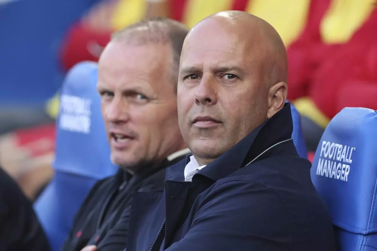 Liverpool's manager Arne Slot waits for the start of the English Premier League soccer match between Brighton and Liverpool at American Express Stadium in Brighton, England, Monday, May 19, 2025. (AP Photo/Ian Walton)