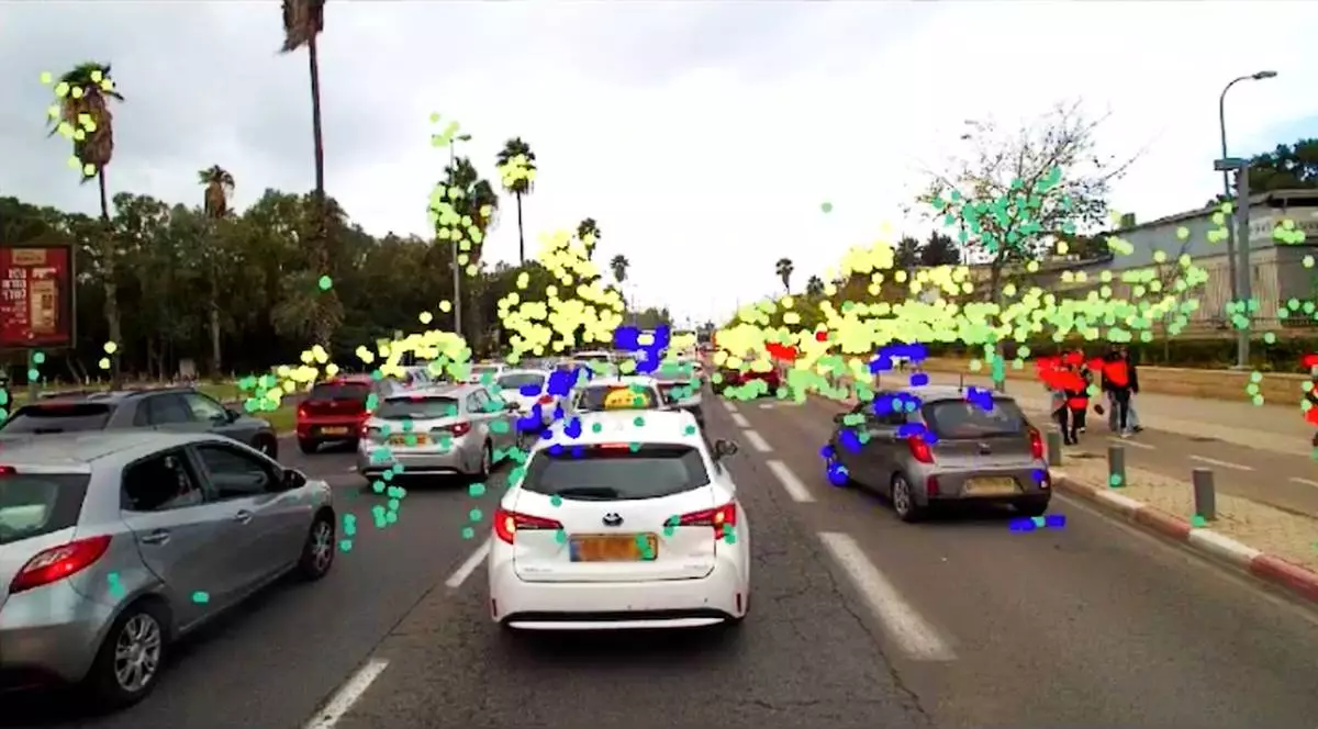 Colored dots simulate the dense data generated by Mobileye Imaging Radar™, offering higher precision than previous systems.