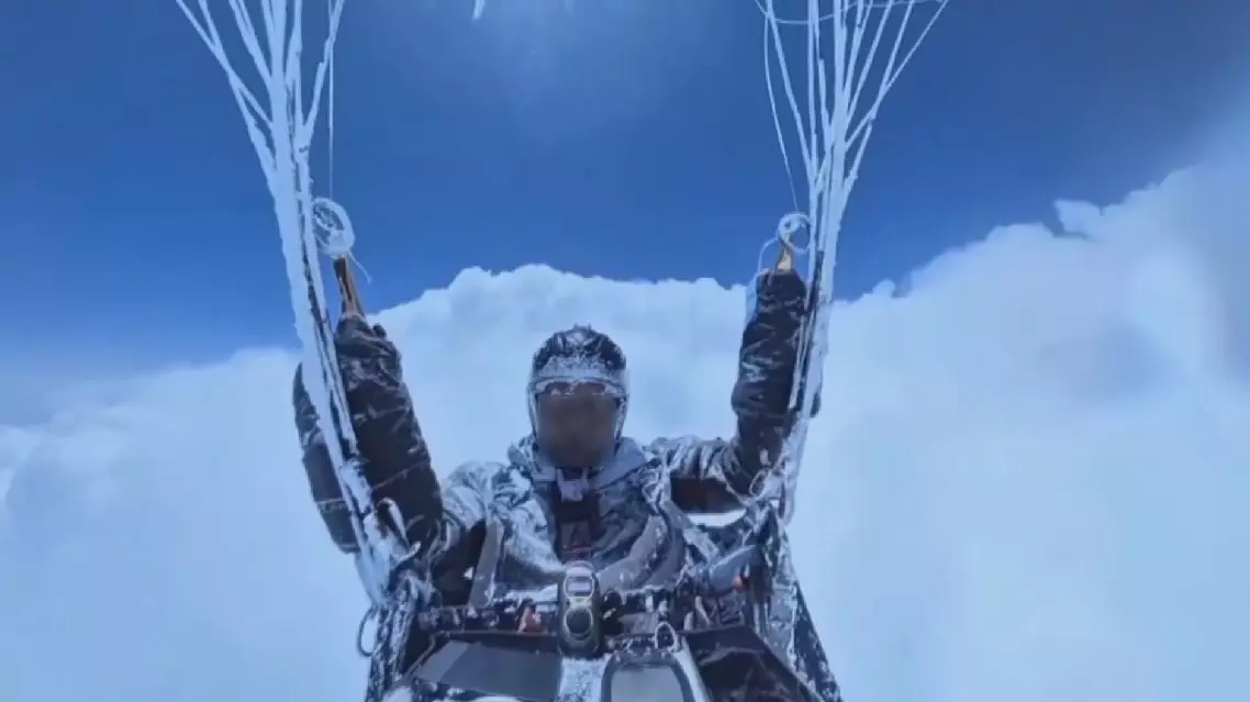 Without an oxygen mask and with his face exposed, Peng endured freezing conditions as ice crystals formed on his face, body and equipment. His gloves were not fully zipped, leaving his hands numb and nearly frozen. Still, he managed to control his paraglider using his compass and radio communication with teammates.