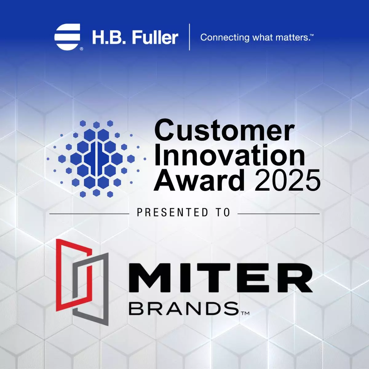 “The MITER Brands team is honored to be recognized with the H.B. Fuller Customer Innovation Award,” said Mike DeSoto, Chief Operating Officer at MITER Brands. “At MITER Brands, we are driven by a vision to build the most valued window and door brand in America. H.B. Fuller has been an exceptional partner in that journey – bringing not only industry-leading adhesive technologies but also a collaborative spirit that helps us push boundaries, create solutions that continuously improve our products, and raise the bar for performance and efficiency.”