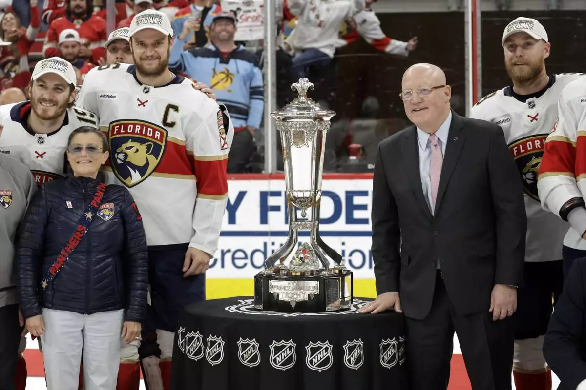 Florida Panthers center Aleksander Barkov (C) and NHL Deputy Commissioner Bill Daly, right, pose with the Prince of Wales trophy at the end of Game 5 of the NHL hockey Stanley Cup Eastern Conference finals Wednesday, May 28, 2025, in Raleigh, N.C. They advance to the Stanley Cup finals. (AP Photo/Chris Seward)