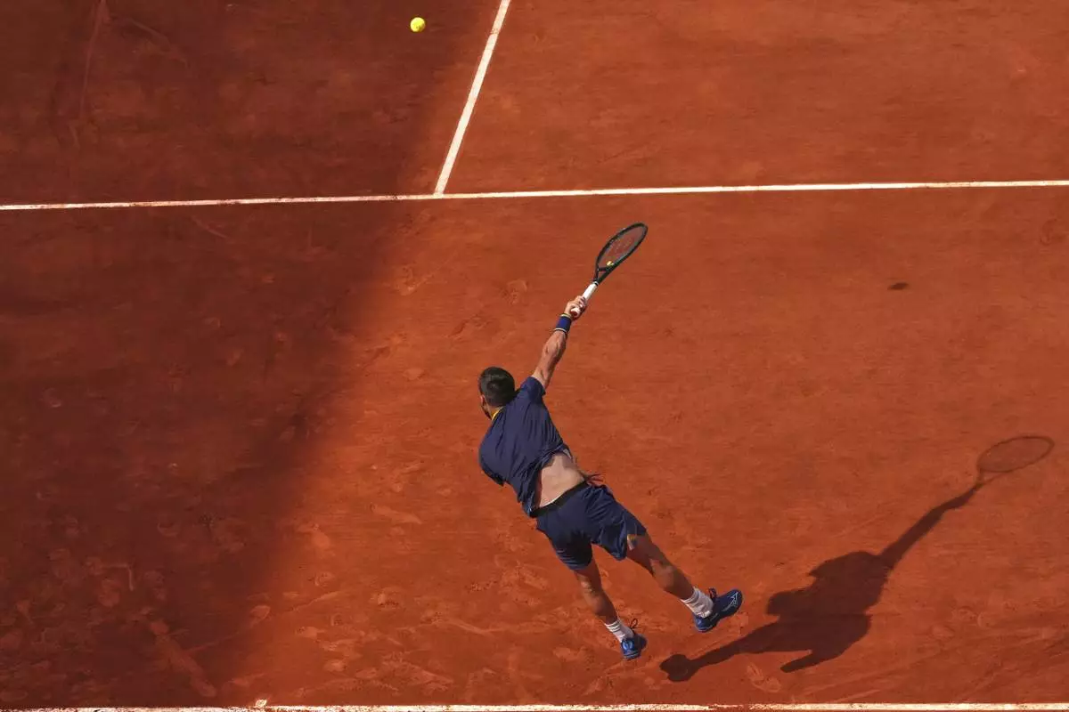 Bosnia and Herzegovina's Damir Dzumhur serves against France's Giovanni Mpetshi Perricard during their second round match of the French Tennis Open, at the Roland-Garros stadium, in Paris, Wednesday, May 28, 2025. (AP Photo/Lindsey Wasson)