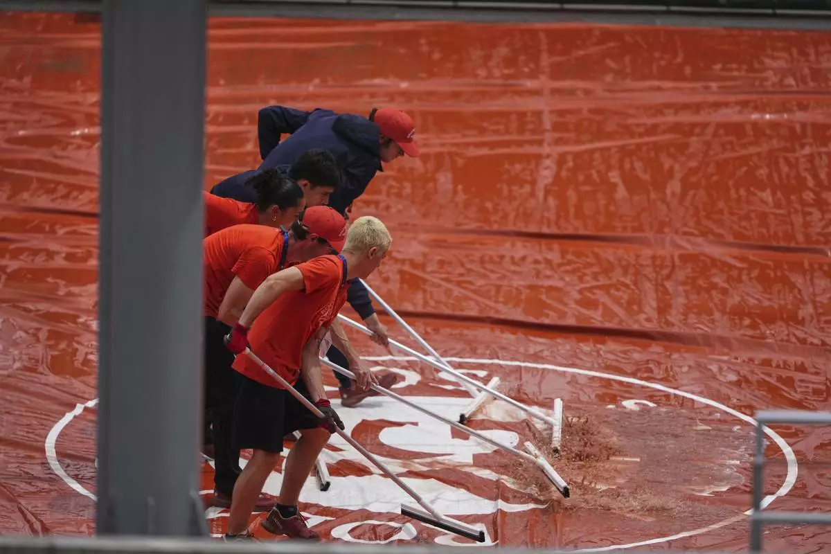 Workers remove water as they shield a court from rain with waterproof material during the French Tennis Open, at the Roland-Garros stadium, in Paris, Wednesday, May 28, 2025. (AP Photo/Lindsey Wasson)