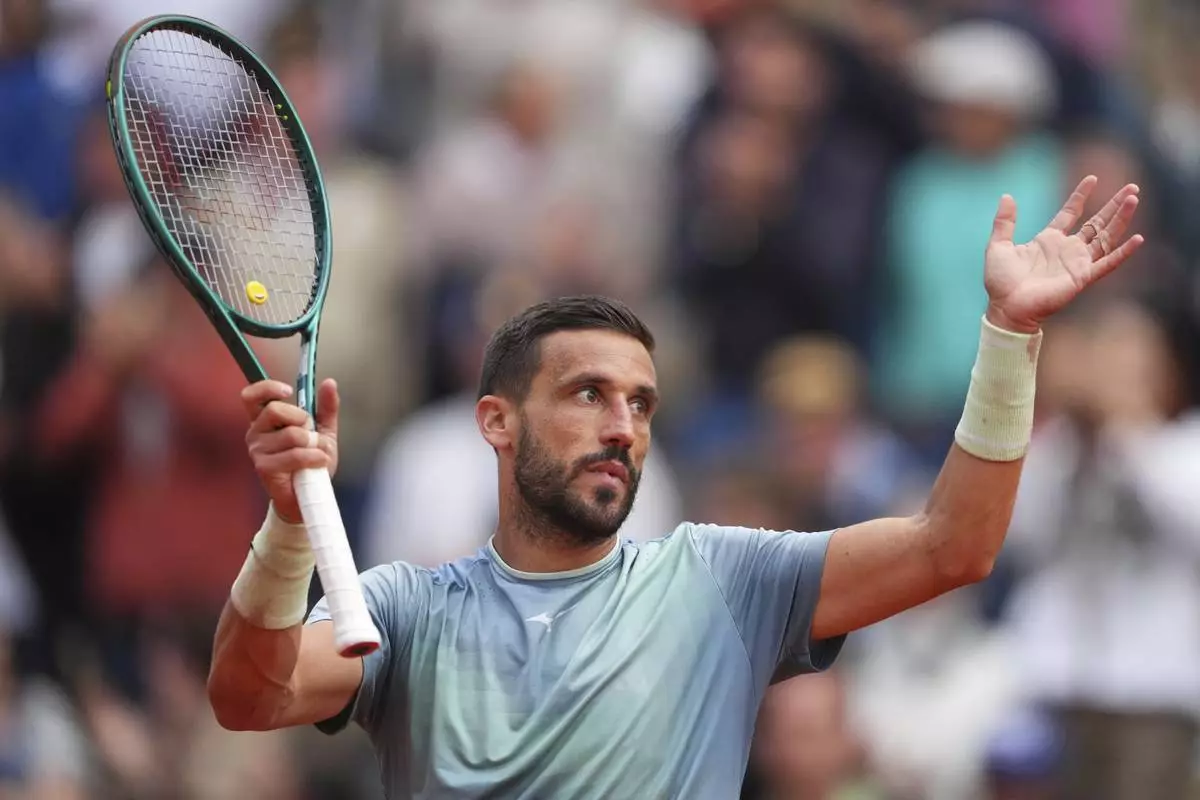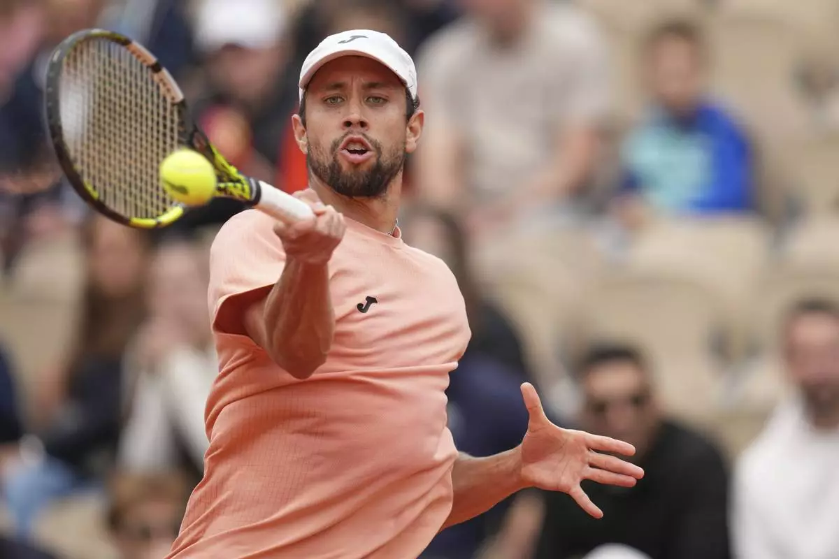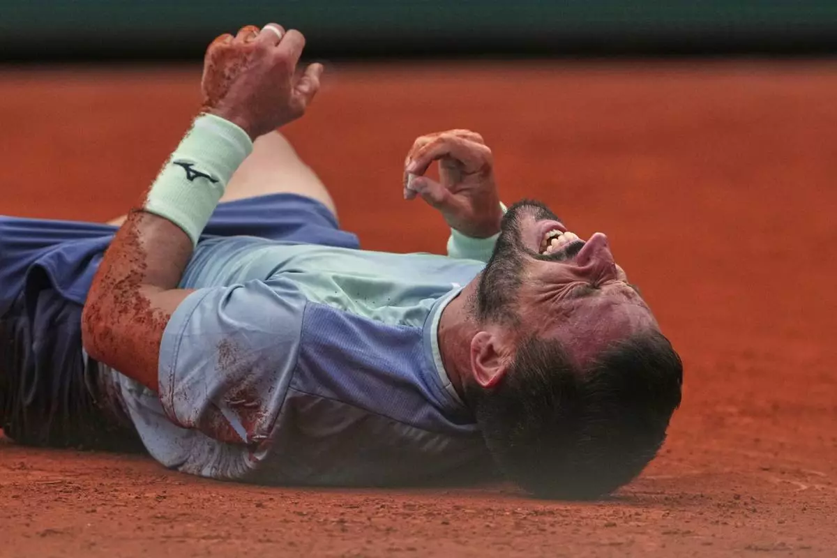 Bosnia and Herzegovina's Damir Dzumhur celebrates after beating France's Giovanni Mpetshi Perricard during their second round match of the French Tennis Open, at the Roland-Garros stadium, in Paris, Wednesday, May 28, 2025. (AP Photo/Lindsey Wasson)