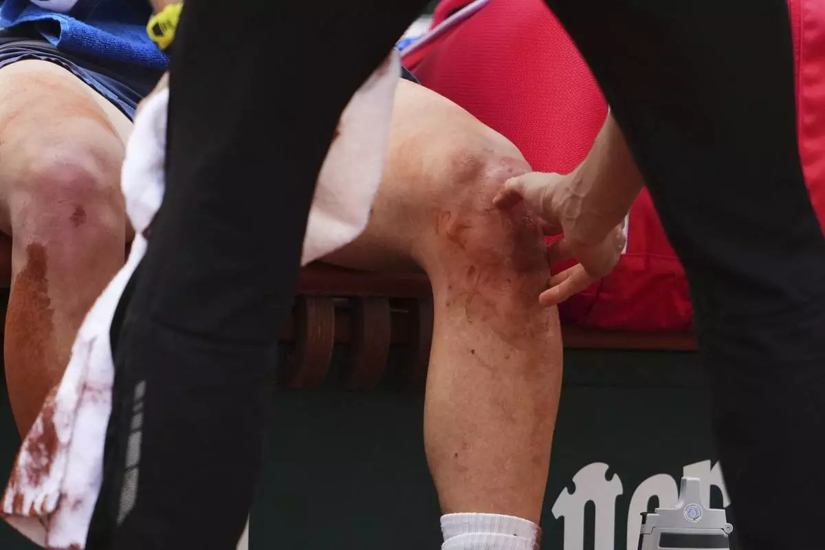 Bosnia and Herzegovina's Damir Dzumhur receives medical assistance as he plays France's Giovanni Mpetshi Perricard , during their second round match of the French Tennis Open, at the Roland-Garros stadium, in Paris, Wednesday, May 28, 2025. (AP Photo/Lindsey Wasson)
