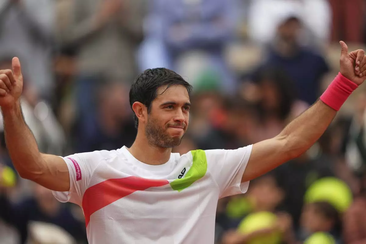 Portugal's Nuno Borges celebrates beating Norway's Casper Ruud during their second round match of the French Tennis Open, at the Roland-Garros stadium, in Paris, Wednesday, May 28, 2025. (AP Photo/Lindsey Wasson)
