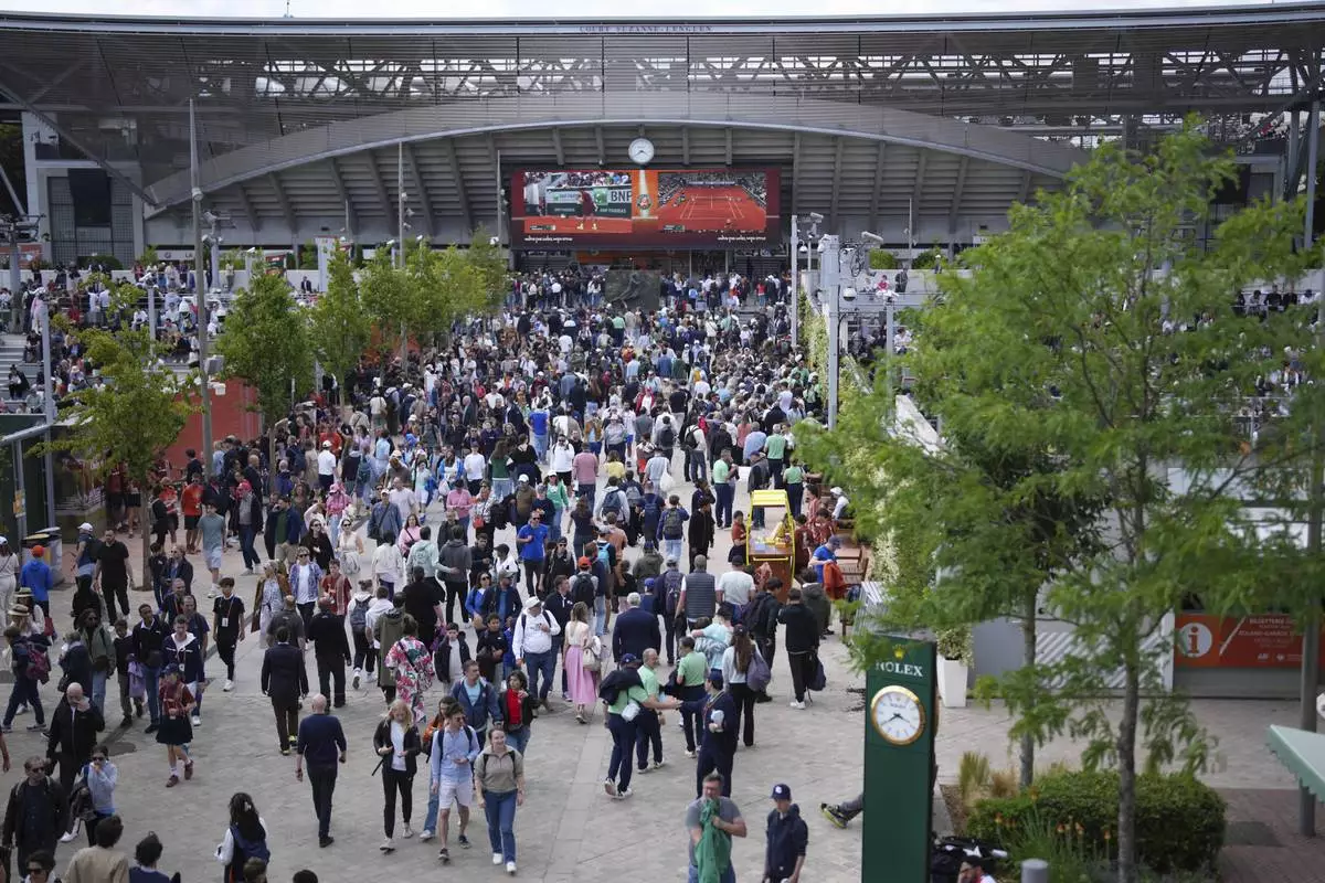 People walk along the Roland-Garros stadium, in Paris, Wednesday, May 28, 2025. (AP Photo/Aurelien Morissard)