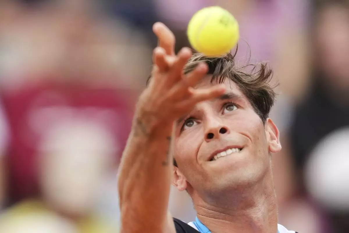 Colombia's Daniel Elahi Galan returns the ball to Italy's Lorenzo Musetti during their second round match of the French Tennis Open, at the Roland-Garros stadium, in Paris, Wednesday, May 28, 2025. (AP Photo/Christophe Ena)