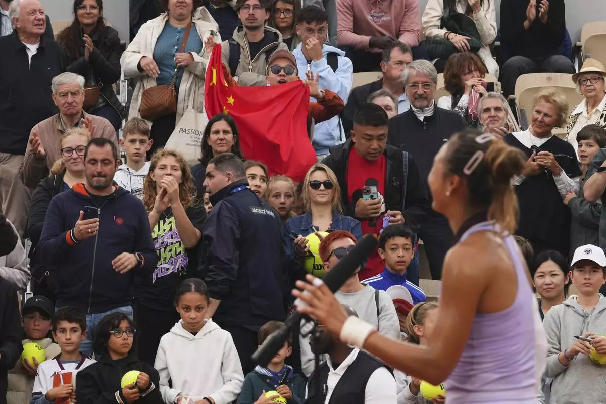 China's Zheng Qinwen celebrates with fans after beating Colombia's Emiliana Arango during their second round match of the French Tennis Open, at the Roland-Garros stadium, in Paris, Wednesday, May 28, 2025. (AP Photo/Lindsey Wasson)