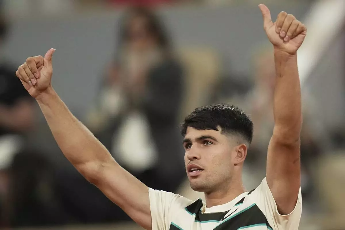 Spain's Carlos Alcaraz celebrates beating Hungary's Fabian Maroszan after their second round match of the French Tennis Open, at the Roland-Garros stadium, in Paris, Wednesday, May 28, 2025. (AP Photo/Christophe Ena)
