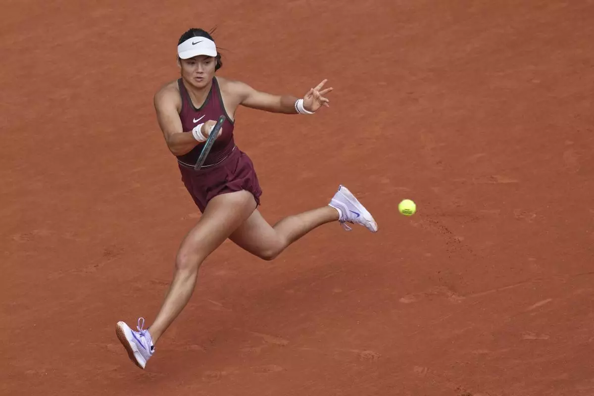 Britain's Emma Raducanu reacts winning a point to Poland's Iga Swiatek during their second round match of the French Tennis Open, at the Roland-Garros stadium, in Paris, Wednesday, May 28, 2025. (AP Photo/Christophe Ena)