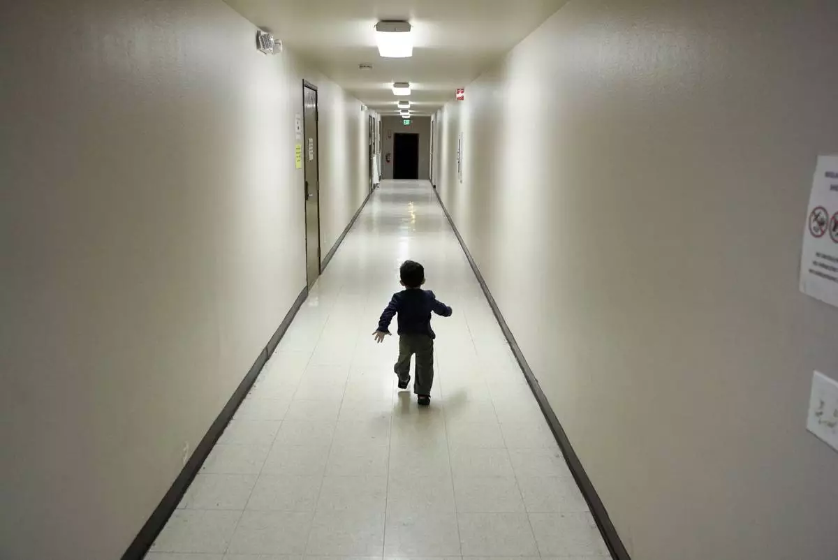 FILE - An asylum-seeking boy from Central America runs down a hallway after arriving from an immigration detention center to a shelter in San Diego, Dec. 11, 2018. (AP Photo/Gregory Bull, File)