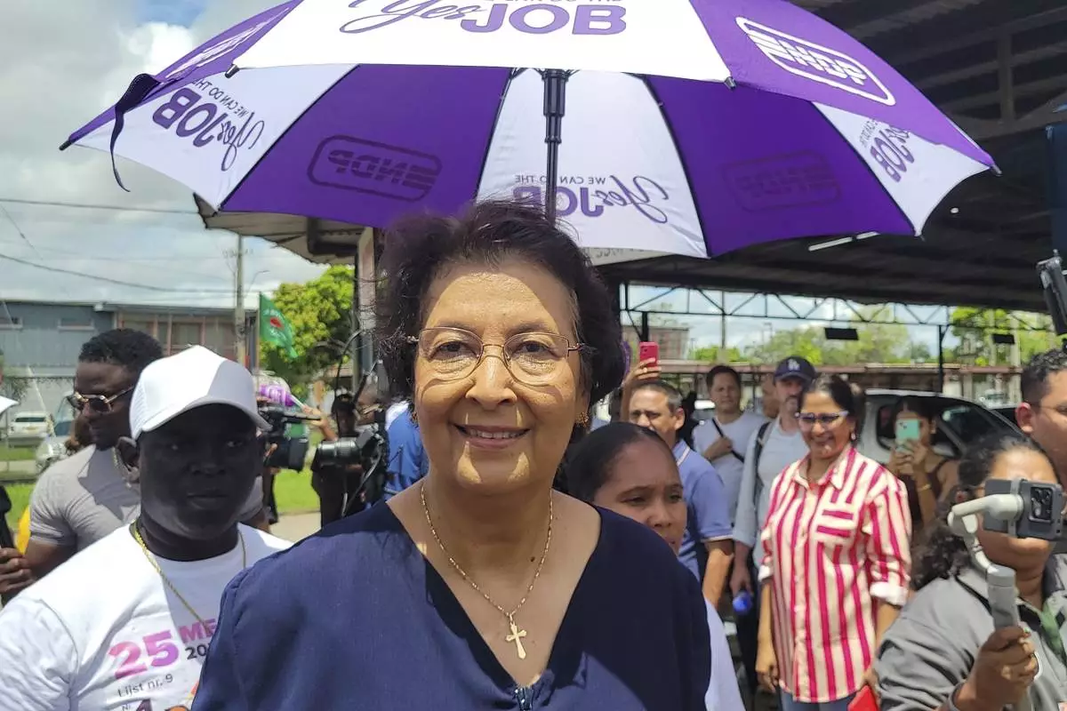 Jennifer Geerlings-Simons, of the National Democratic Party, walks to a voting center to cast her ballot during the National Assembly election in Paramaribo, Suriname, Sunday, May 25, 2025. (AP Photo/Sharon Singh)