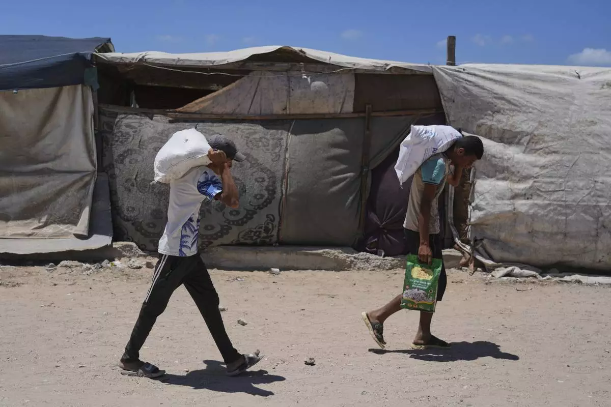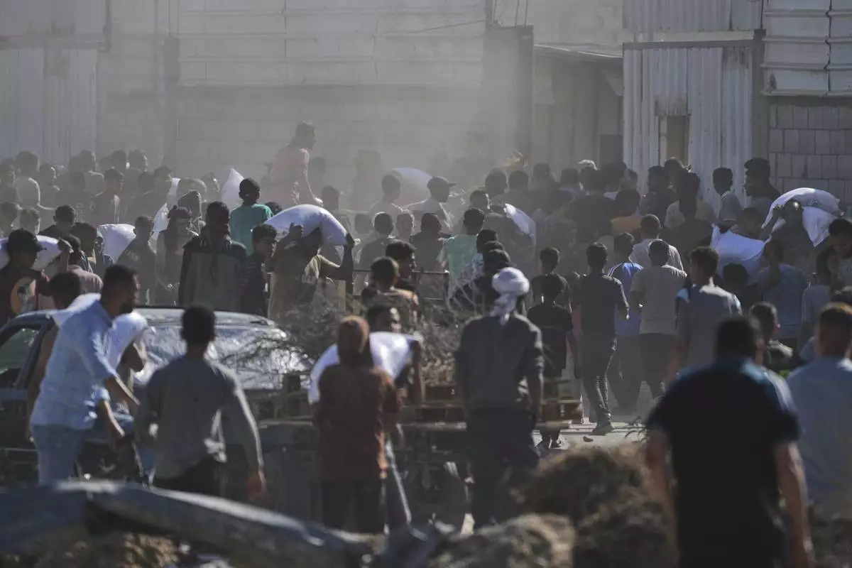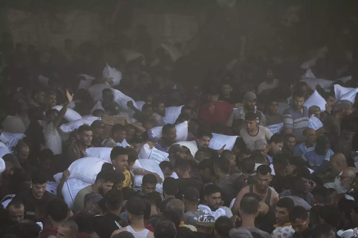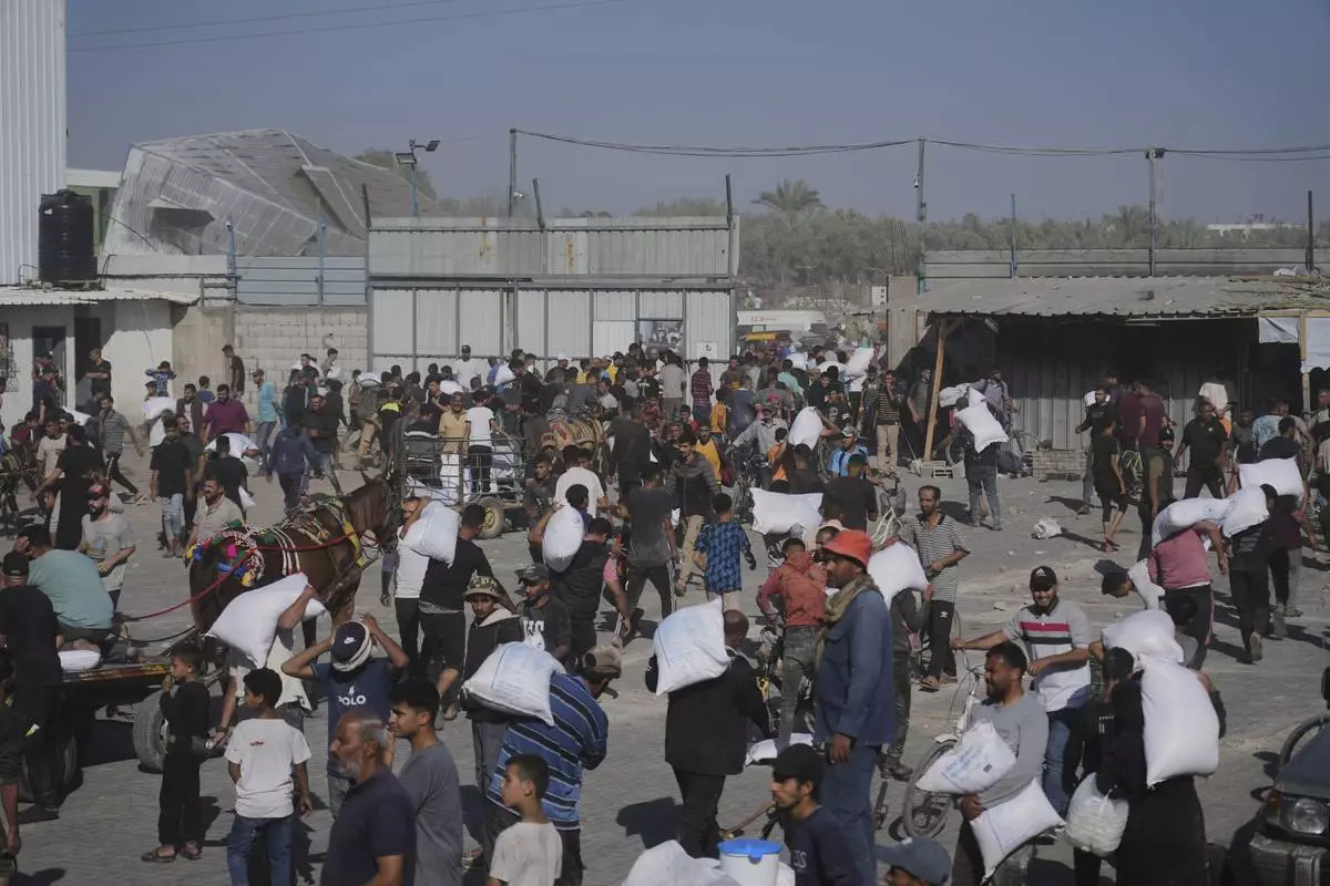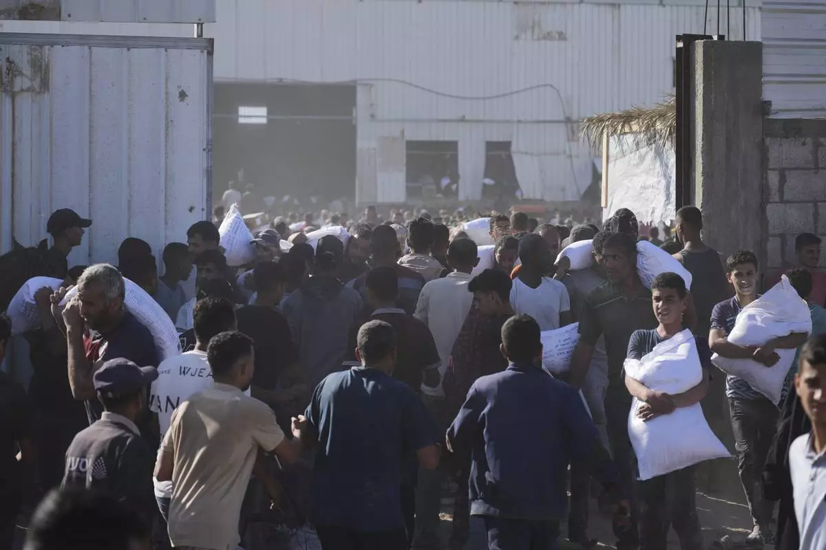 Palestinians carry bags of flour after storming a U.N. World Food Program warehouse in Zawaida, Central Gaza Strip, on Wednesday, May 28, 2025. (AP Photo/Abdel Kareem Hana)