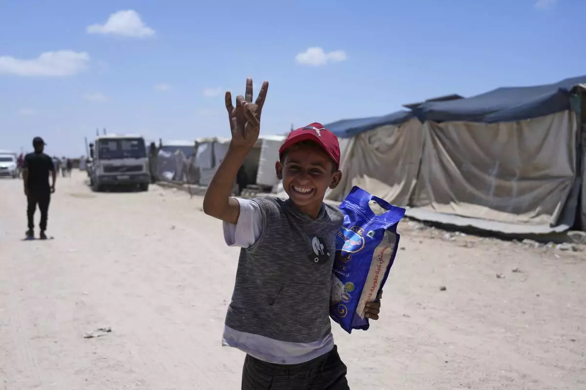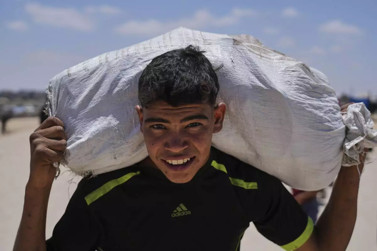 A Palestinian child smiles to the camera as carries a bag of rice delivered by the U.S.-backed Gaza Humanitarian Foundation, after receiving the supplies in Rafah, as he arrive in Khan Younis, southern Gaza Strip, on Wednesday, May 28, 2025. (AP Photo/Abdel Kareem Hana)