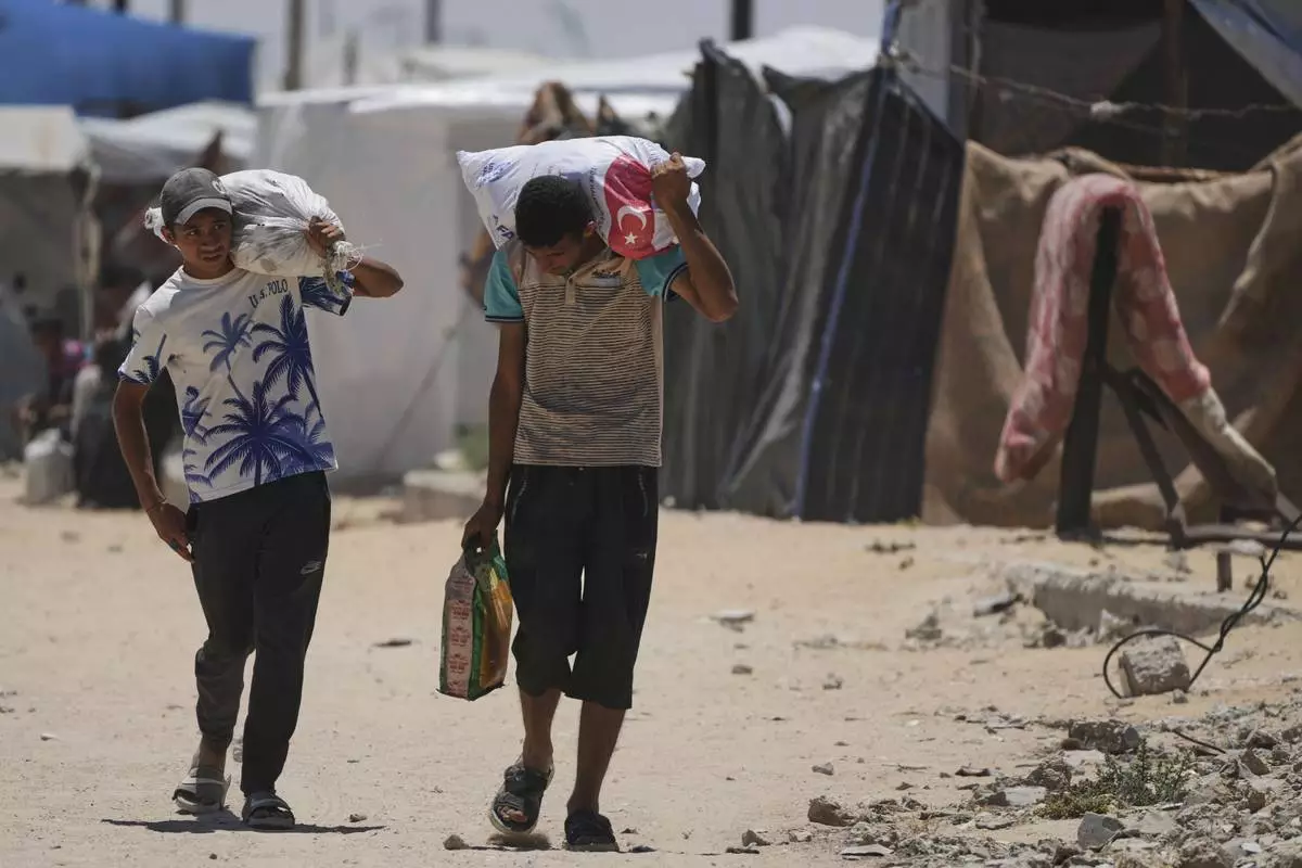 Palestinians carry food and humanitarian aid delivered by the U.S.-backed Gaza Humanitarian Foundation, after receiving the supplies in Rafah, as they arrive in Khan Younis, southern Gaza Strip, on Wednesday, May 28, 2025. (AP Photo/Abdel Kareem Hana)