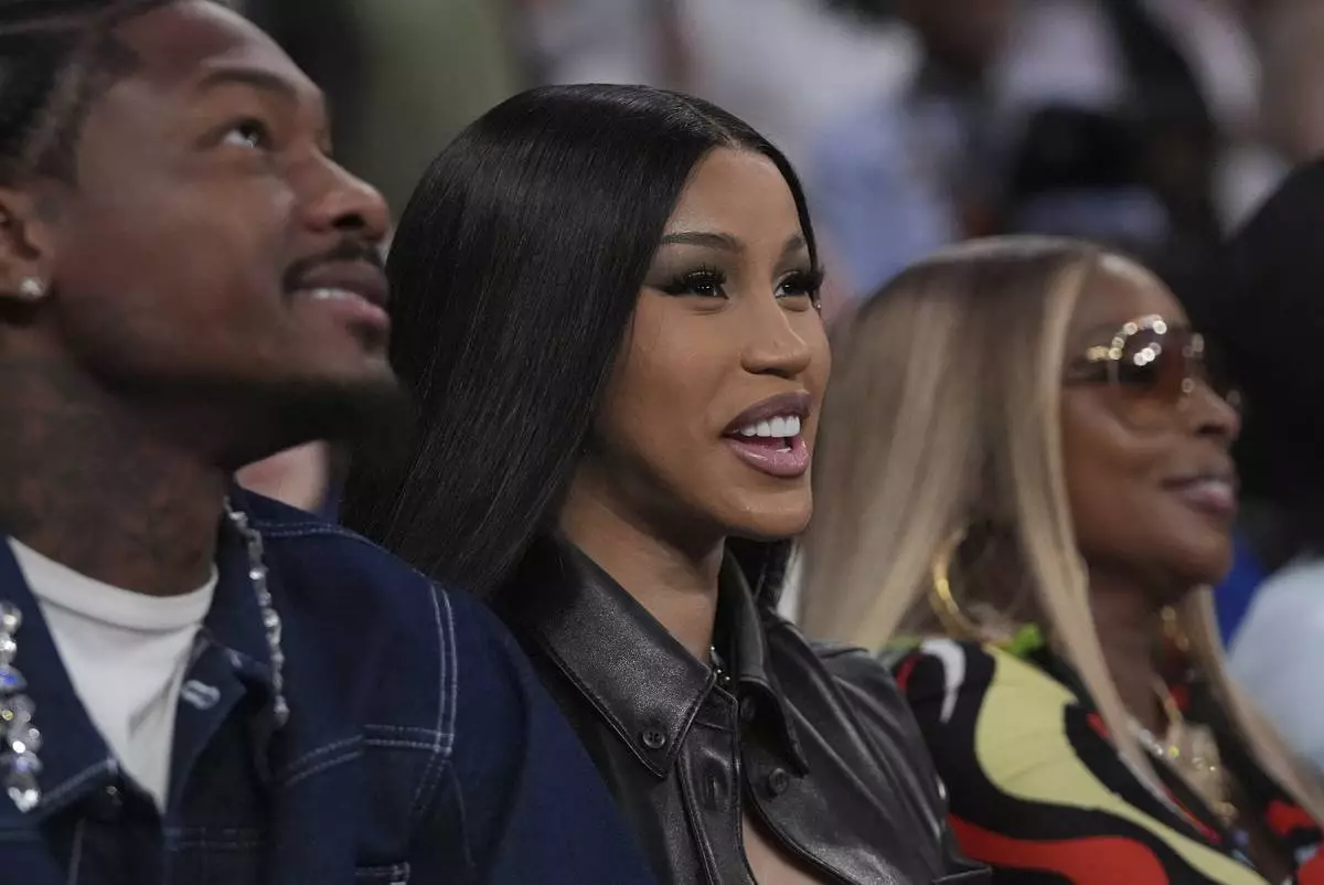 FILE - Cardi B, center, Stefon Diggs, left, and Mary J Blige, right, watch during the second half of Game 4 in the Eastern Conference semifinals of the NBA basketball playoffs between the New York Knicks and the Boston Celtics Monday, May 12, 2025, in New York. (AP Photo/Frank Franklin II, File)