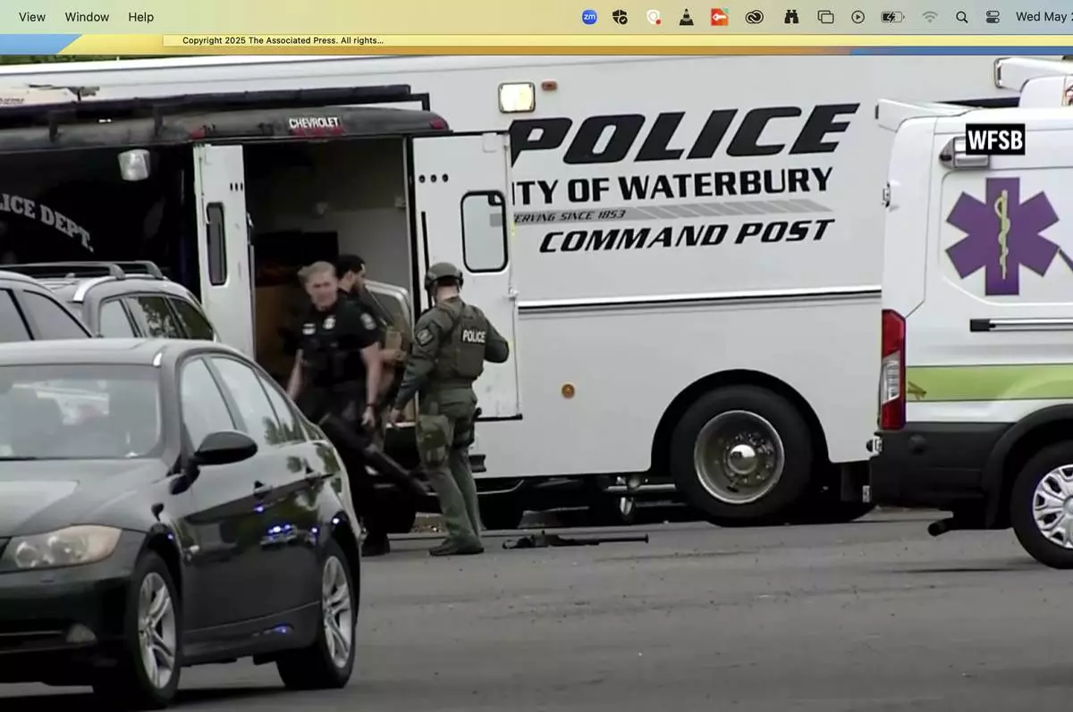 This still image made from video provided by WFSB-TV shows armed police officers and a police truck outside of the Brass Mill Center in Waterbury, Conn., May 27, 2025. (WFSB-TV via AP)