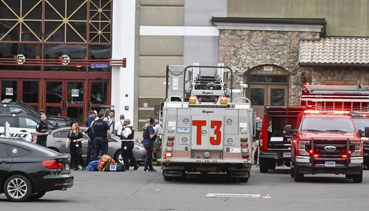 Waterbury police and emergency first responders are at Brass Mill Center, where several people were shot on Tuesday afternoon, May 27, 2025, in Waterbury, Conn. (Jim Shannon/Hearst Connecticut Media via AP)