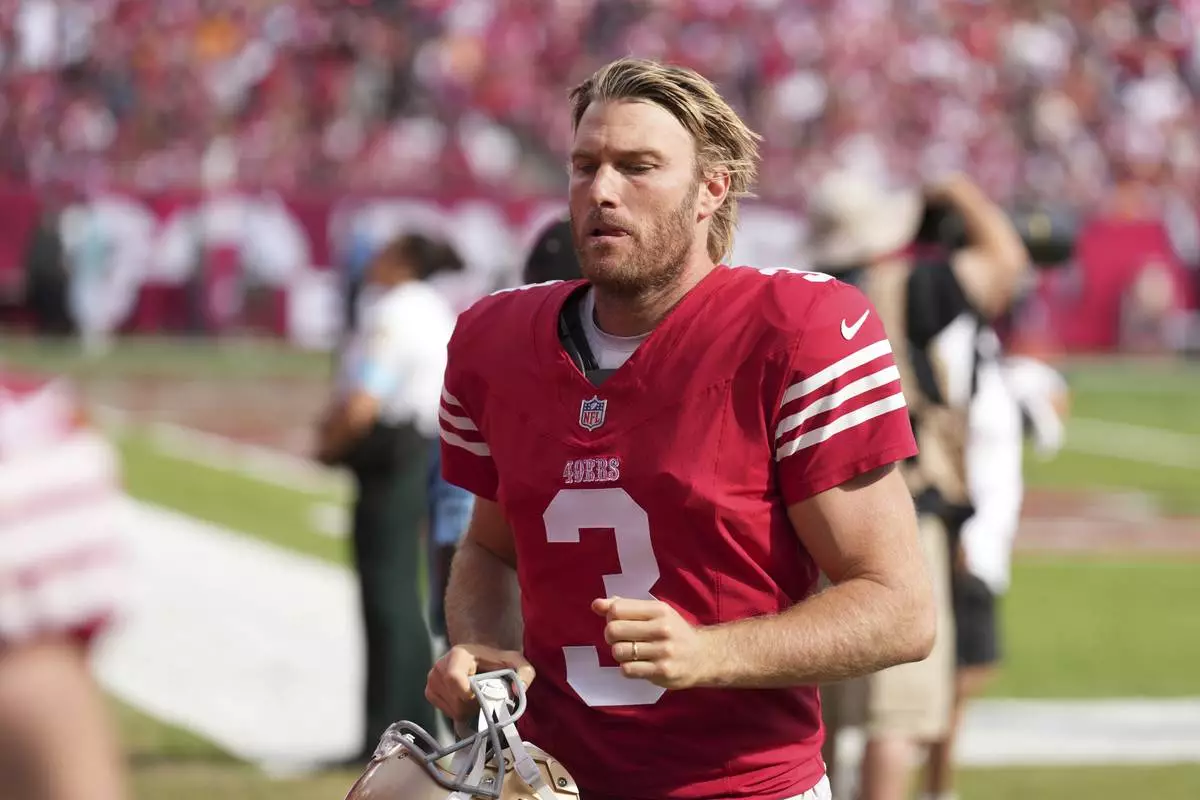 FILE - San Francisco 49ers punter Mitch Wishnowsky (3) leaves the field at half time during an NFL football game against the Tampa Bay Buccaneers, Sunday, Nov. 10, 2024, in Tampa, Fla. (AP Photo/Peter Joneleit,File)