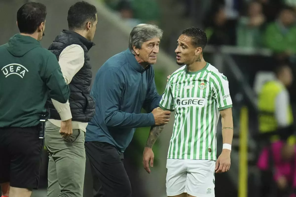 Betis' head coach Manuel Pellegrini talks to Antony during the Europa League final soccer match between Real Betis and Chelsea in Wroclaw, Poland, Wednesday, May 28, 2025. (AP Photo/Petr David Josek)