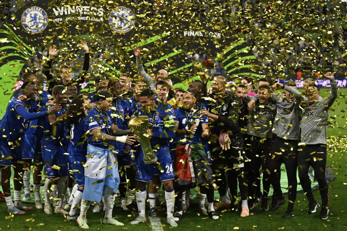 Chelsea's players celebrates after winning the Europa Conference League final soccer match between Real Betis and Chelsea in Wroclaw, Poland, Wednesday, May 28, 2025. (AP Photo/Darko Vojinovic)