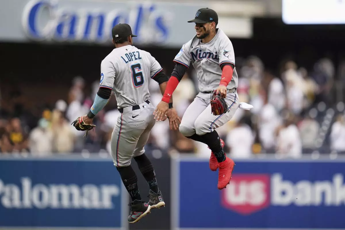 Miami Marlins center fielder Victor Mesa Jr., right, and shortstop Otto Lopez (6) celebrate after the Marlins defeated the San Diego Padres 10-8 in a baseball game Wednesday, May 28, 2025, in San Diego. (AP Photo/Gregory Bull)
