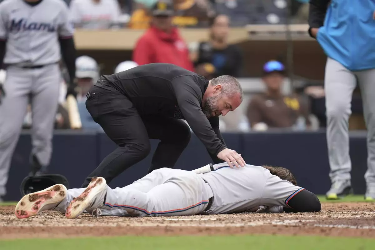Miami Marlins' Connor Norby stays down after getting hit in the helmet by a pitch during the eighth inning of a baseball game against the San Diego Padres Wednesday, May 28, 2025, in San Diego. (AP Photo/Gregory Bull)