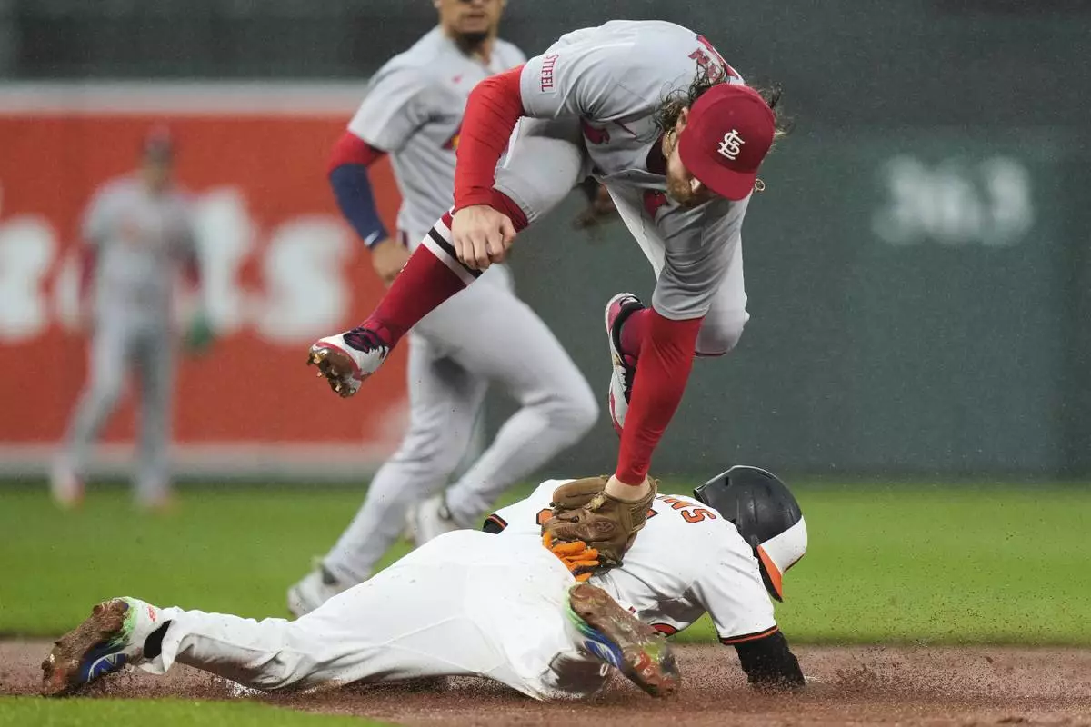 Baltimore Orioles' Cedric Mullins, below, steals second base in front of St. Louis Cardinals second baseman Brendan Donovan during the second inning of a baseball game, Wednesday, May 28, 2025, in Baltimore. (AP Photo/Stephanie Scarbrough)