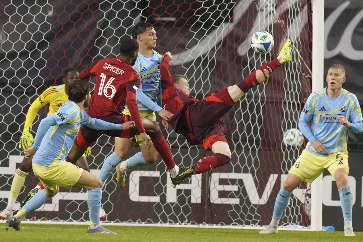 Toronto FC's Ola Brynhildsen (second right) makes an overhead attempt on the Philadelphia Union goal during first half MLS action in Toronto, on Wednesday, May 28, 2025. (Chris Young/The Canadian Press via AP)